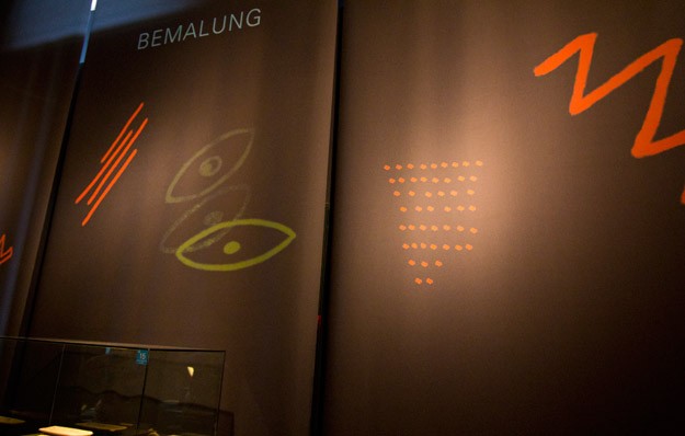 Die Verortung von Raum und Zeit stand am Anfang der Ausstellung. Handelsbeziehungen und die damit verbundenen Seewege wurden in einer großräumigen, medialen Inszenierung thematisiert. Großformatige Landschaftscollagen erzeugten die Atmosphäre für die Präsentation der anmutigen Idole. Dass auf den Kykladen aber nicht immer die Sonne scheint, dokumentierten auch Fotos von Winterstürmen. Den Schwerpunkt der Schau bildete die sorgfältig ausgeleuchtete Präsentation der Idole. Neuere Forschungen weisen nach, dass die Figuren immer wieder neu bemalt wurden. Eine kinoartige Aufprojektion, auf in Gips gefertigten Kopien, spielte diverse mögliche Bemalungen von nachgewiesenen Befunden bis hin zu spekulativeren Varianten durch. Welchen Sinn und Bedeutung hatten diese Bemalungen? Auch diese Frage wurde aufgegriffen und den Besuchern mögliche Interpretationen angeboten – ohne diese allerdings abschließend beantworten zu können. Ein Credo von Ranger Design ist, die Besucher an aktuellen Fragestellungen teilhaben zu lassen, auch wenn es keine verbindlichen Antworten gibt und nur spekulative Aussagen möglich sind.