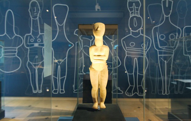 Die Verortung von Raum und Zeit stand am Anfang der Ausstellung. Handelsbeziehungen und die damit verbundenen Seewege wurden in einer großräumigen, medialen Inszenierung thematisiert. Großformatige Landschaftscollagen erzeugten die Atmosphäre für die Präsentation der anmutigen Idole. Dass auf den Kykladen aber nicht immer die Sonne scheint, dokumentierten auch Fotos von Winterstürmen. Den Schwerpunkt der Schau bildete die sorgfältig ausgeleuchtete Präsentation der Idole. Neuere Forschungen weisen nach, dass die Figuren immer wieder neu bemalt wurden. Eine kinoartige Aufprojektion, auf in Gips gefertigten Kopien, spielte diverse mögliche Bemalungen von nachgewiesenen Befunden bis hin zu spekulativeren Varianten durch. Welchen Sinn und Bedeutung hatten diese Bemalungen? Auch diese Frage wurde aufgegriffen und den Besuchern mögliche Interpretationen angeboten – ohne diese allerdings abschließend beantworten zu können. Ein Credo von Ranger Design ist, die Besucher an aktuellen Fragestellungen teilhaben zu lassen, auch wenn es keine verbindlichen Antworten gibt und nur spekulative Aussagen möglich sind.