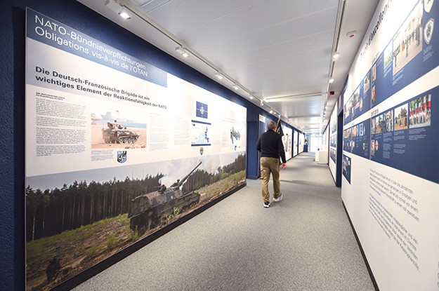 der dortigen neuen Ausstellung, welche die Vielfältigkeit und weltweite Einzigartigkeit des binationalen Großverbandes hinsichtlich von Auftrag, Fähigkeiten und Trruppenteilen in einem modernen, ansprechenden und informativen Ausstellungskonzept darstellt. Besucherinnen und Besucher können sich anhand ausgewählter Meilensteine in der Geschichte der Deutsch-Französischen Brigade über ihre konkrete Bewährung im In- uns Ausland informieren. Die Perspektive ist dabei immer binational sowie zukunftsorientiert ausgerichtet und beleuchtet