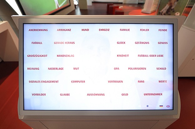 Zwei Touchscreens laden in der Ausstellung „Mensch, Uli – Ein Leben für den FC Bayern“ ein, kurze, gefilmte Statements von Uli Hoeneß zu bestimmten Stichworten zu hören und zu sehen.