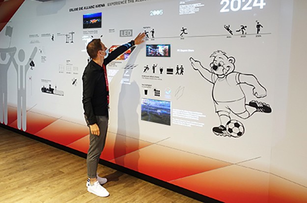 Neue Wege der Kommunikation beschreitet der Allianz Arena Showroom. Die vielfältigen kreativen Möglichkeiten der von den Architekten Herzog & de Meuron gestalteten Stadion-Fassade der Allianz Arena können die Besucher interaktiv erleben. Weitere interaktiv abrufbare Informationen liefert – ohne direkte Berührung – eine mit Piktogrammen gestaltete große Wandfläche, auf die weitere Informationen, Filme, Fotos, Fragen und Antworten aufproijziert werden. Geräusche ergänzen die interaktiven Animationen.