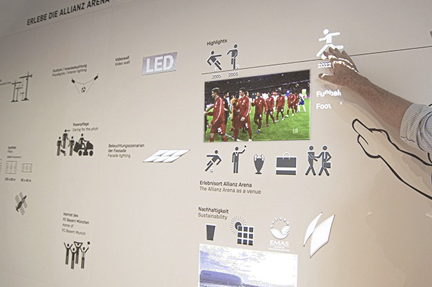 Neue Wege der Kommunikation beschreitet der Allianz Arena Showroom. Die vielfältigen kreativen Möglichkeiten der von den Architekten Herzog & de Meuron gestalteten Stadion-Fassade der Allianz Arena können die Besucher interaktiv erleben. Weitere interaktiv abrufbare Informationen liefert – ohne direkte Berührung – eine mit Piktogrammen gestaltete große Wandfläche, auf die weitere Informationen, Filme, Fotos, Fragen und Antworten aufproijziert werden. Geräusche ergänzen die interaktiven Animationen.