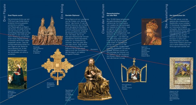 Ausstellung und informierende Werbung präsentieren sich aus einem Guß: Das Leitmotiv bilden kreuzende Linien, mit Konstanz als Schnittpunkt und ausstrahlendem Zentrum, kurz vor Beginn der Renaissance. |