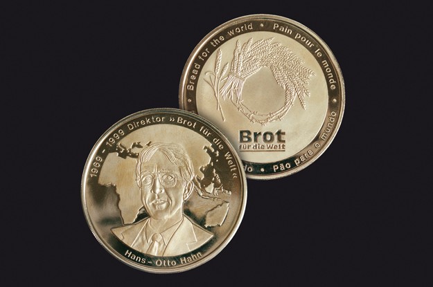 "Brot für die Welt" versucht überall dort zu helfen, wo die Not am größten ist. Genauso wichtig wie das Geld für diese Hilfsaktionen, sind engagierte Mitarbeiterinnen und Mitarbeiter. All jene, die sich dabei besonders verdient machen, ehrt die Diakonie mit einer Medaille, die ihrem langjährigen Direktor Hans-Otto Hahn gewidmet ist. Das Design dafür ist ein Geschenk von Ranger Design an die Hilfsorganisation. Um eine anmutige und hochwertige Wirkung zu erzielen, setzt die Medaille auf ein Wechselspiel zwischen glatt und glänzend in der Oberfläche. |
